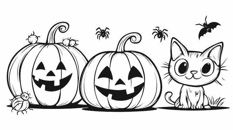 Midjourney Prompt: simple cute smiling Halloween pumpkin with spider and cat coloring page, no background white black outline only, simple shapes, low details, bold lines, no shadingImage Usage Suggestion: Colouring pages for kids or adults. Printable downloadable content Etsy shop.