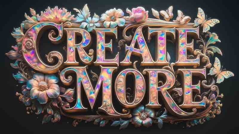 Ideogram Prompt: A 3d render photo of a vibrant illustration of the word "Create More" in intricate gold typography. The letters are adorned with ornate flowers, leaves, and butterflies. The background is dark. The overall image has a shimmering, iridescent quality, reminiscent of opal or crystal.Image Usage Suggestion: Social media, posters, print products