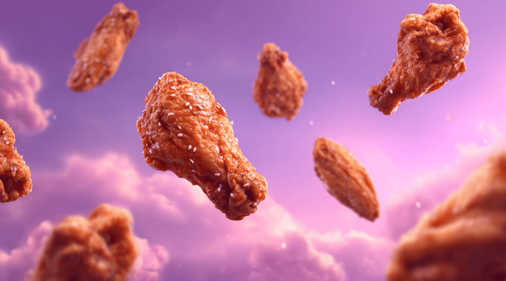 cinematic photo of a delicious buffalo wings falling from the sky, violet background, advertising appealImage Usage Suggestion: Food advertising campaigns or restaurant marketing materials