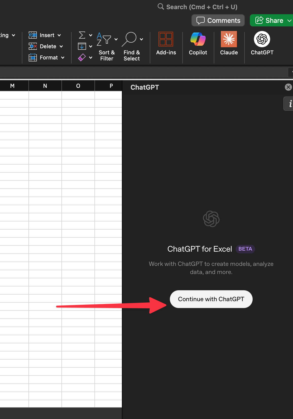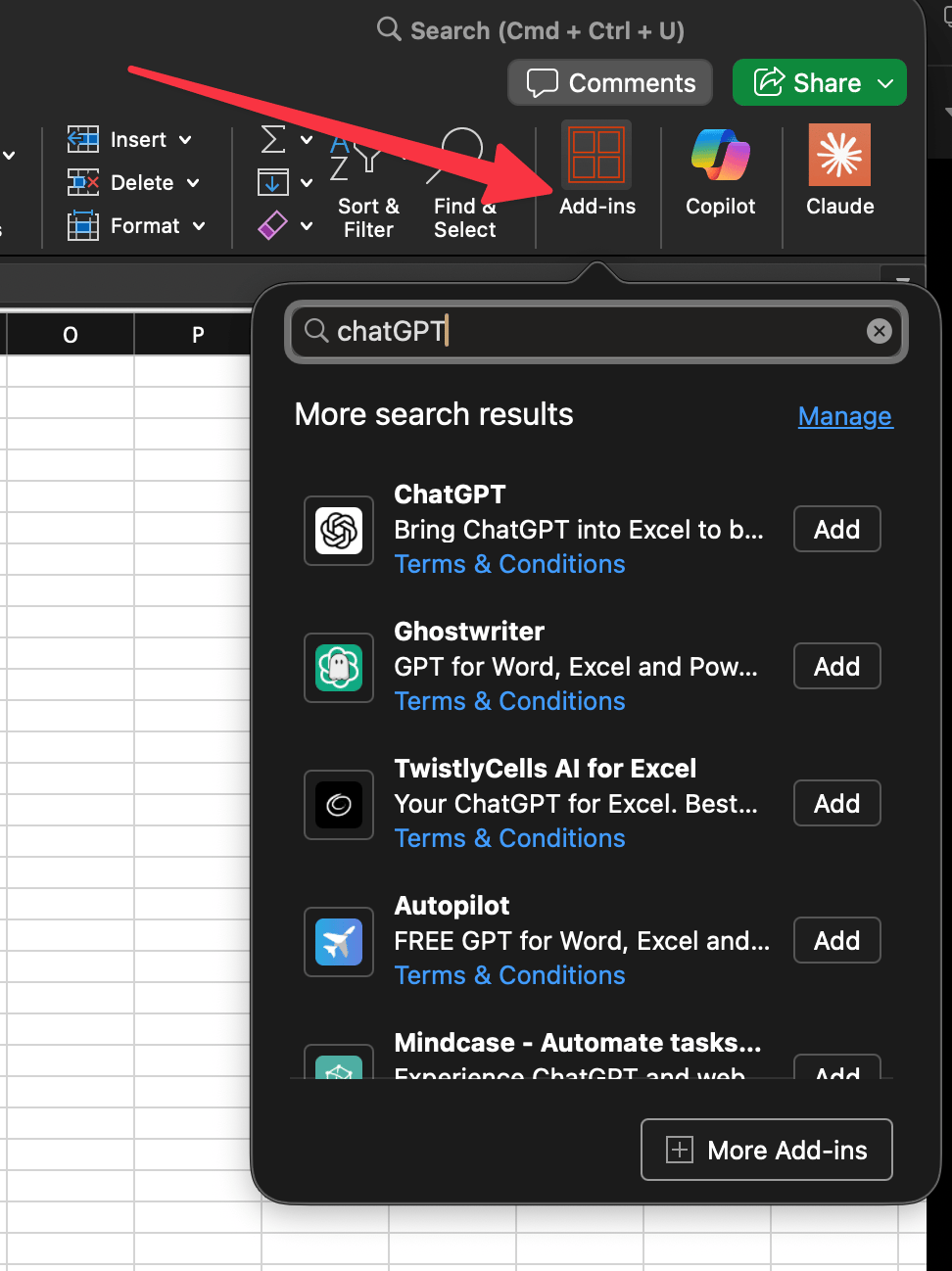 Open Excel and go to the Insert tab. Click "Get Add-ins" and search for "ChatGPT." Install the official OpenAI add-in.