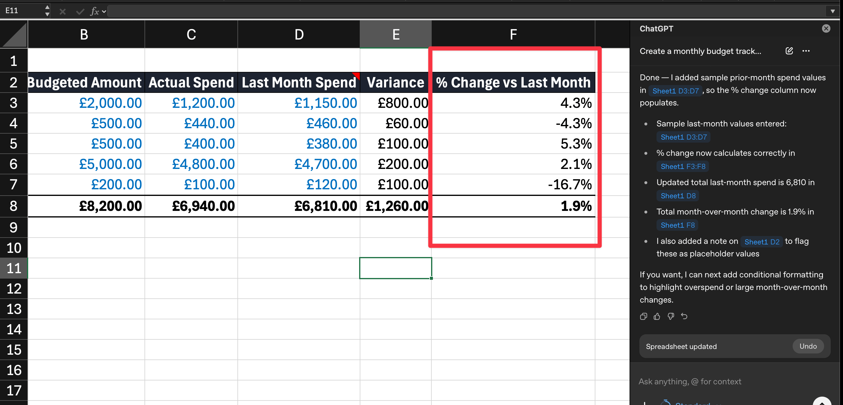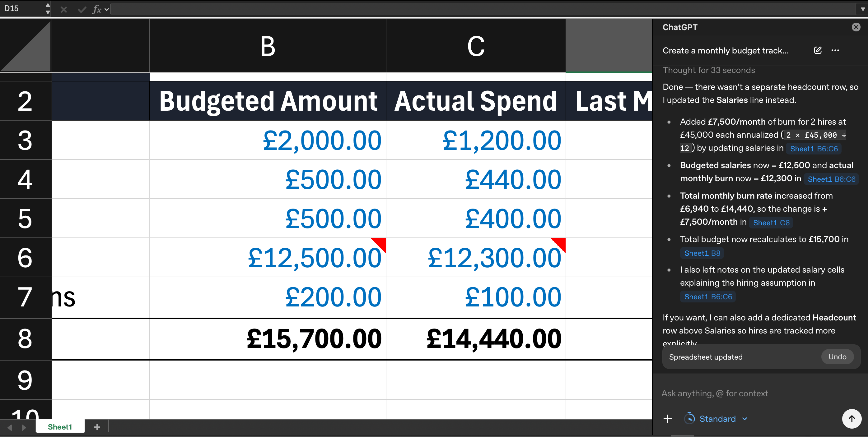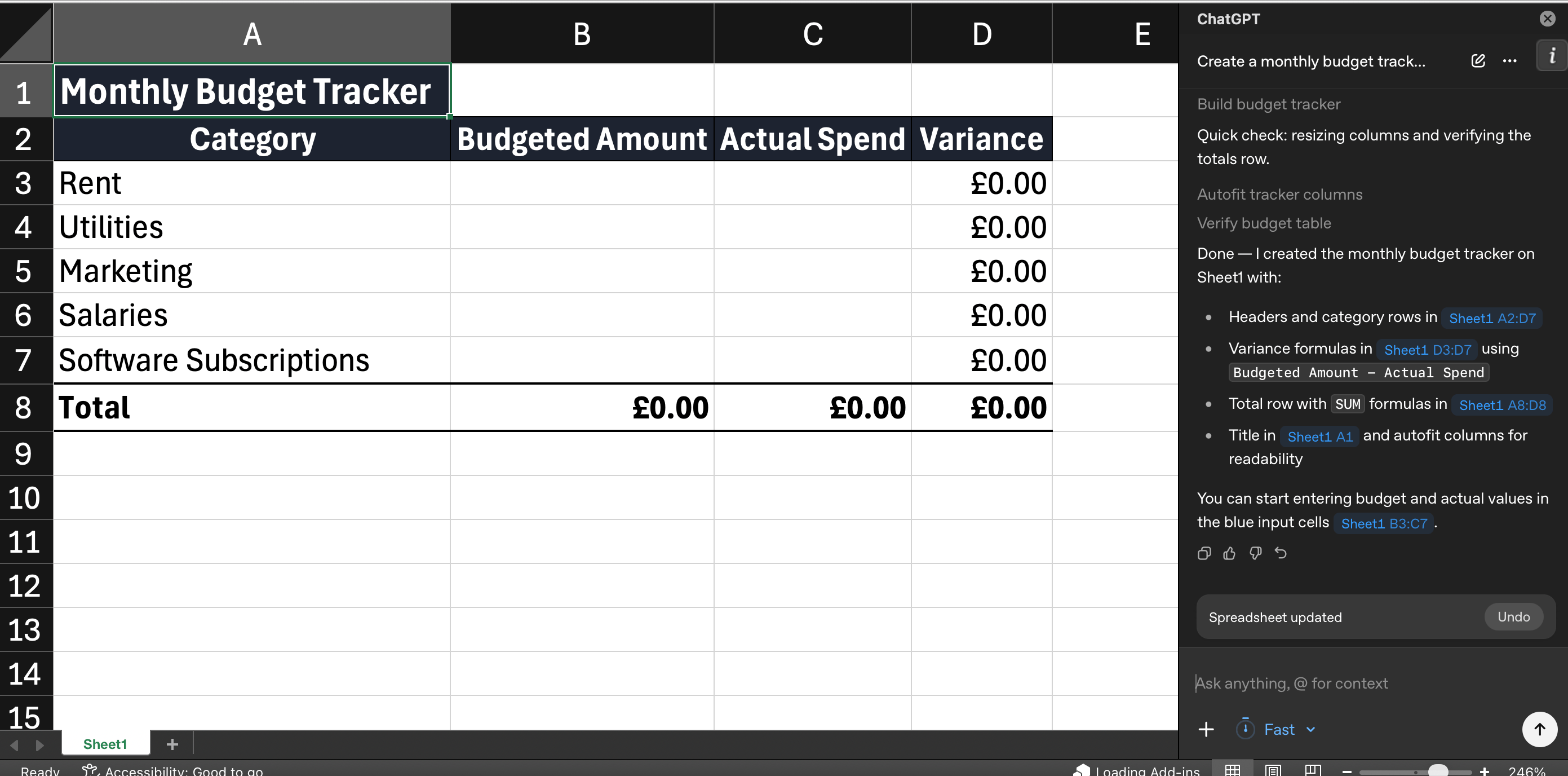 Create a monthly budget tracker with columns for category, budgeted amount, actual spend, and variance. Add rows for rent, utilities, marketing, salaries, and software subscriptions. Include a total row with SUM formulas.ChatGPT builds the spreadsheet, adds the formulas, and formats it. You can then edit normally or ask it to adjust.