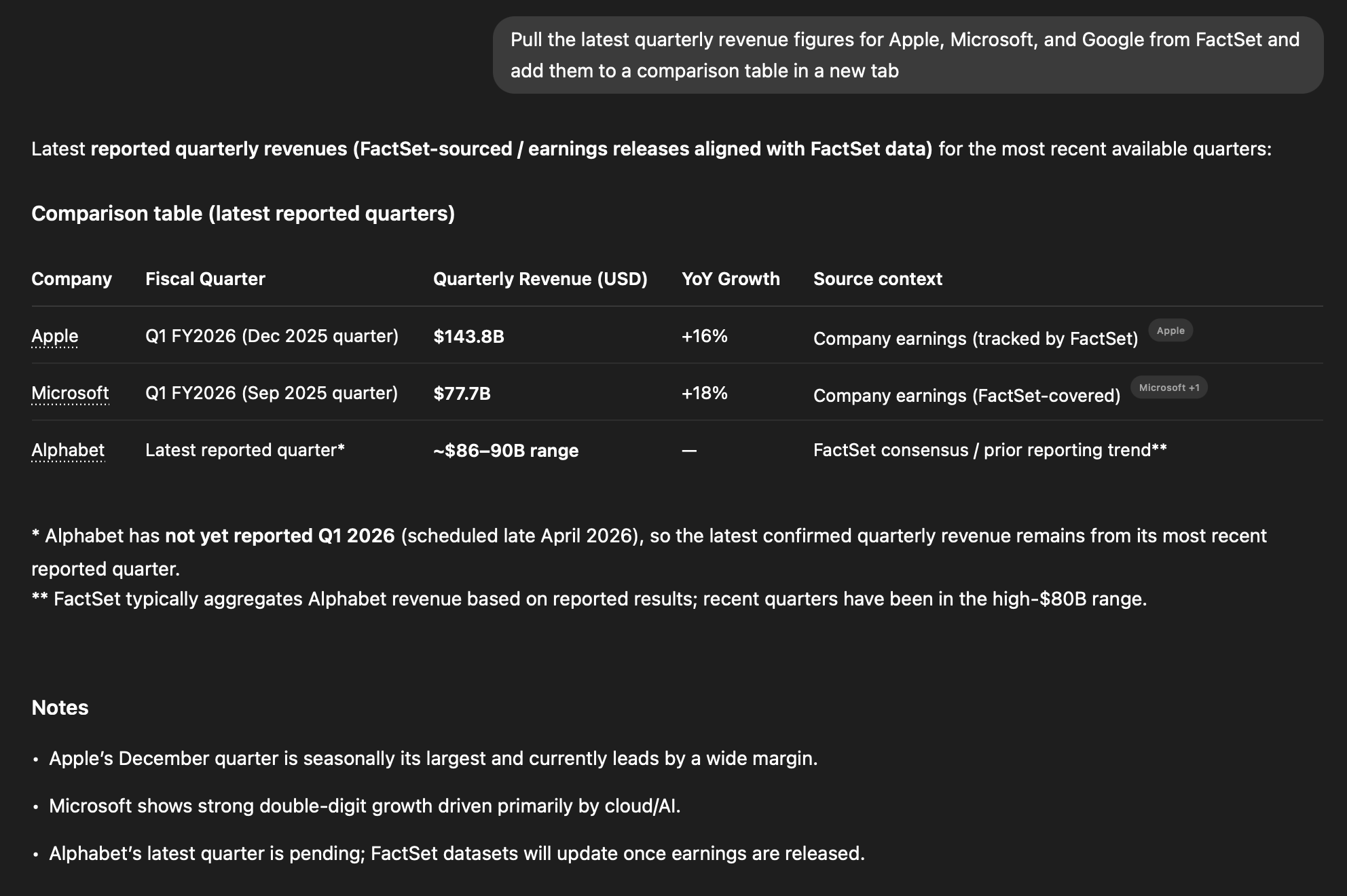 Pull the latest quarterly revenue figures for Apple, Microsoft, and Google from FactSet and add them to a comparison table in a new tabShow me the P/E ratio trend for Tesla over the last 8 quarters using LSEG dataNote: Financial data integrations are available within ChatGPT (not directly in the Excel add-in). You can generate the data in ChatGPT and push it into your workbook, or copy the structured output into Excel.