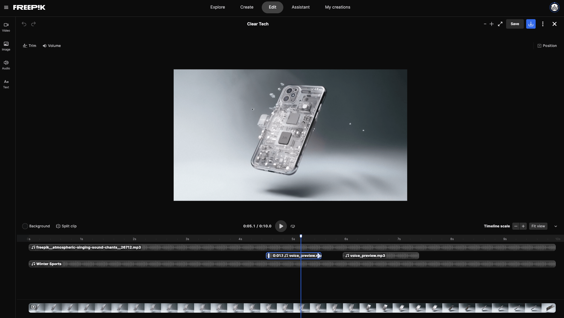 The final stage of the process involves moving to a video editor to assemble all the elements into a cohesive ad. You can use a separate video editor but for this short demo Freepik editor works great. It also makes it easy to insert more AI generated features directly into it. Like voice and sound effects.