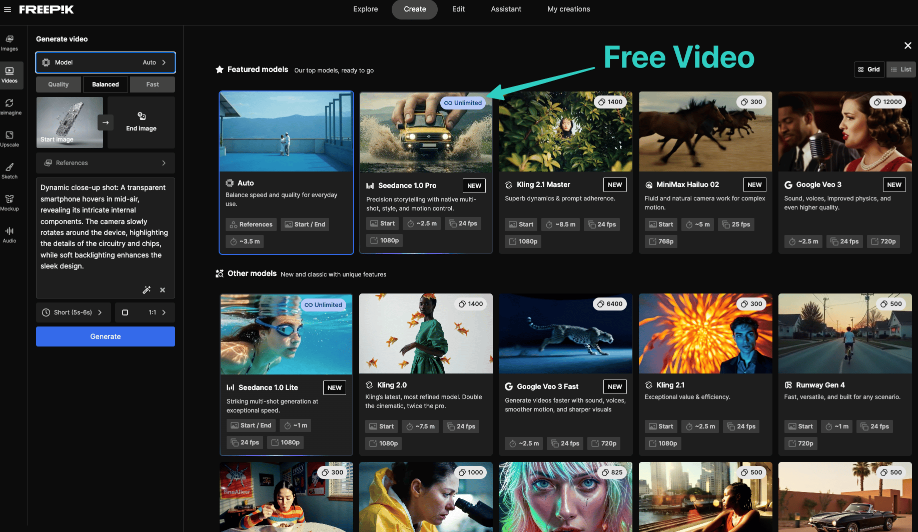 With a refined image, the next step is to bring it to life using Freepik’s video generation tools. I used the MiniMax Hailuo 02 model, which was available for unlimited free use at the time. Currently Seedance 1.0 Pro is free to use.