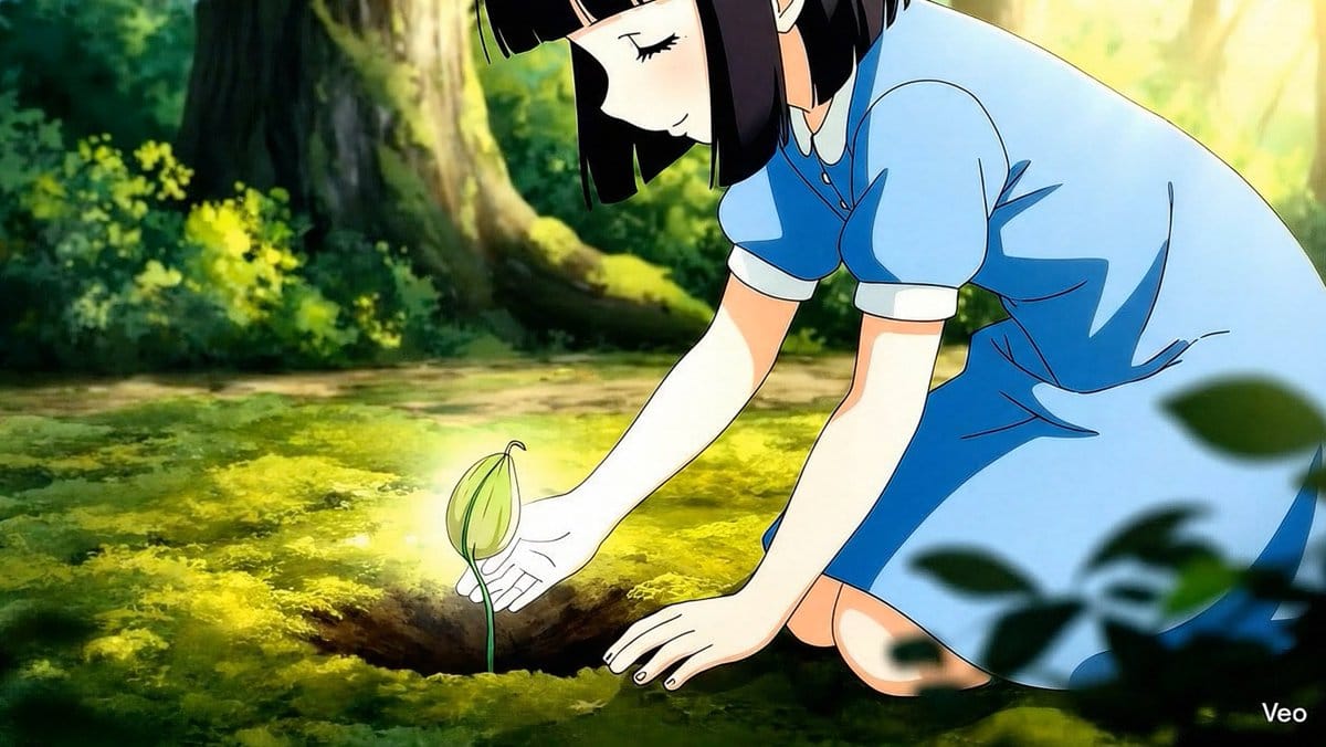 The story I developed: A young woman named Anya discovers a mystical forest spirit (KODAMA) and learns about the connection between nature and magic through planting a special seed.