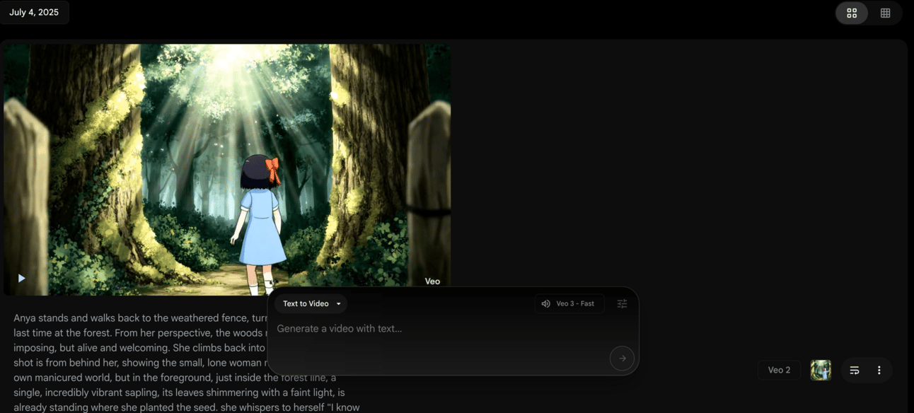 Test 1: Storybook Vibe I started with a storybook aesthetic, complete with light music, bird sounds, and footsteps. The sound effects were incredible – VEO 3 really shines in this department.