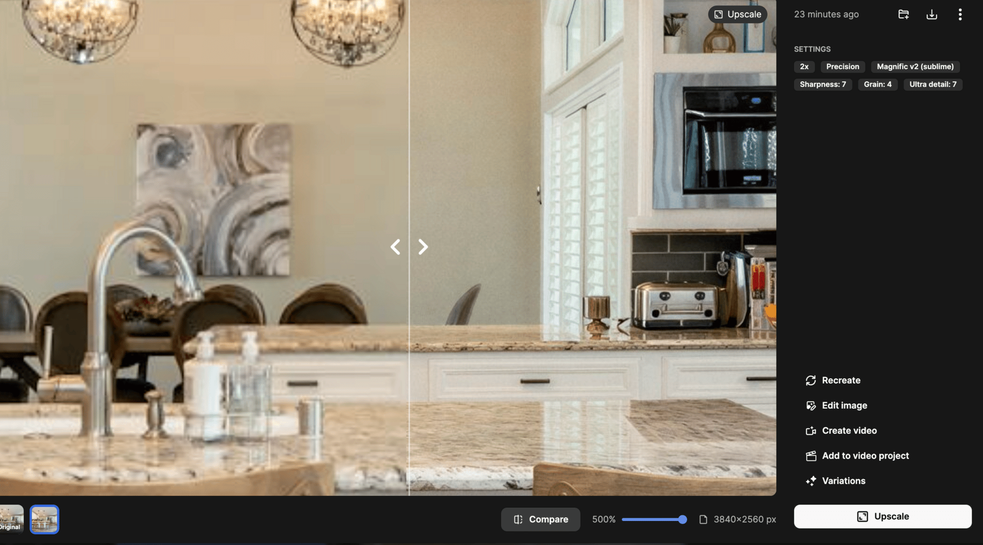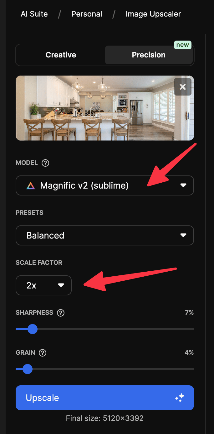 Alternatively you can use the creative upscaler if you don’t need exact image precision. For example AI images that can be slightly different. If it is a real interior photo you need exactly the same choose the precision model.