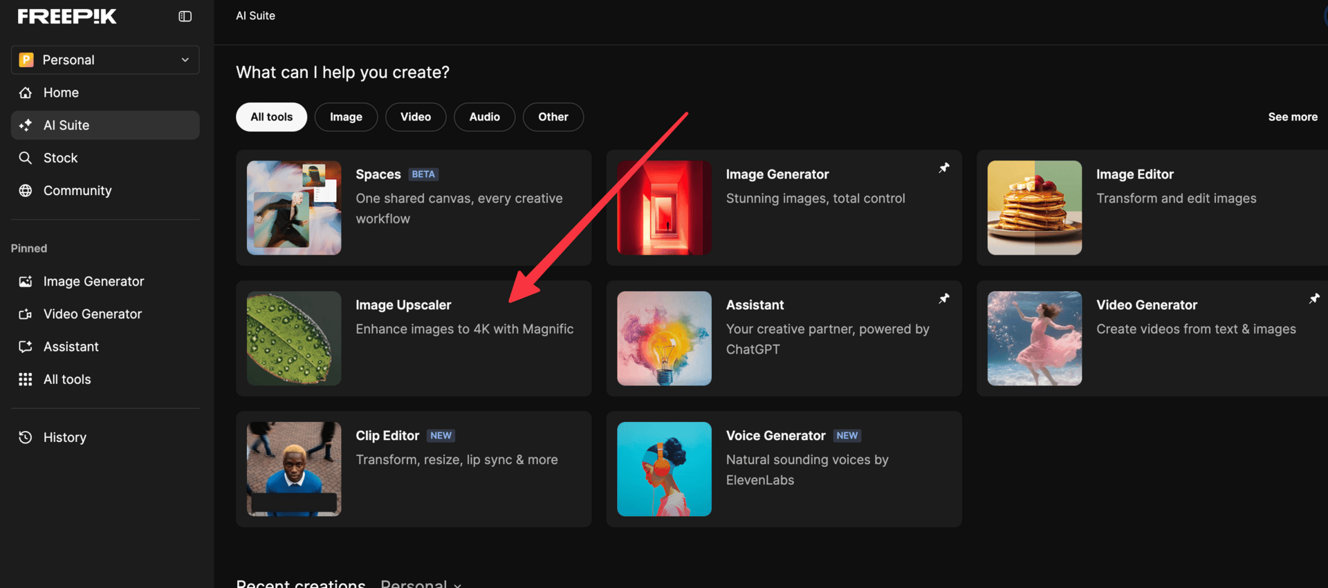 Navigate to Magnific AI and log into your account. In Freepik under AI suite click Image Upscaler.