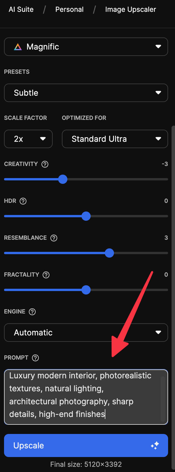 Magnific AI allows you to guide the upscaling with a text prompt (in creative upscaler). This is particularly useful for interior design images. If you are using the precision upscaler you can skip this step.