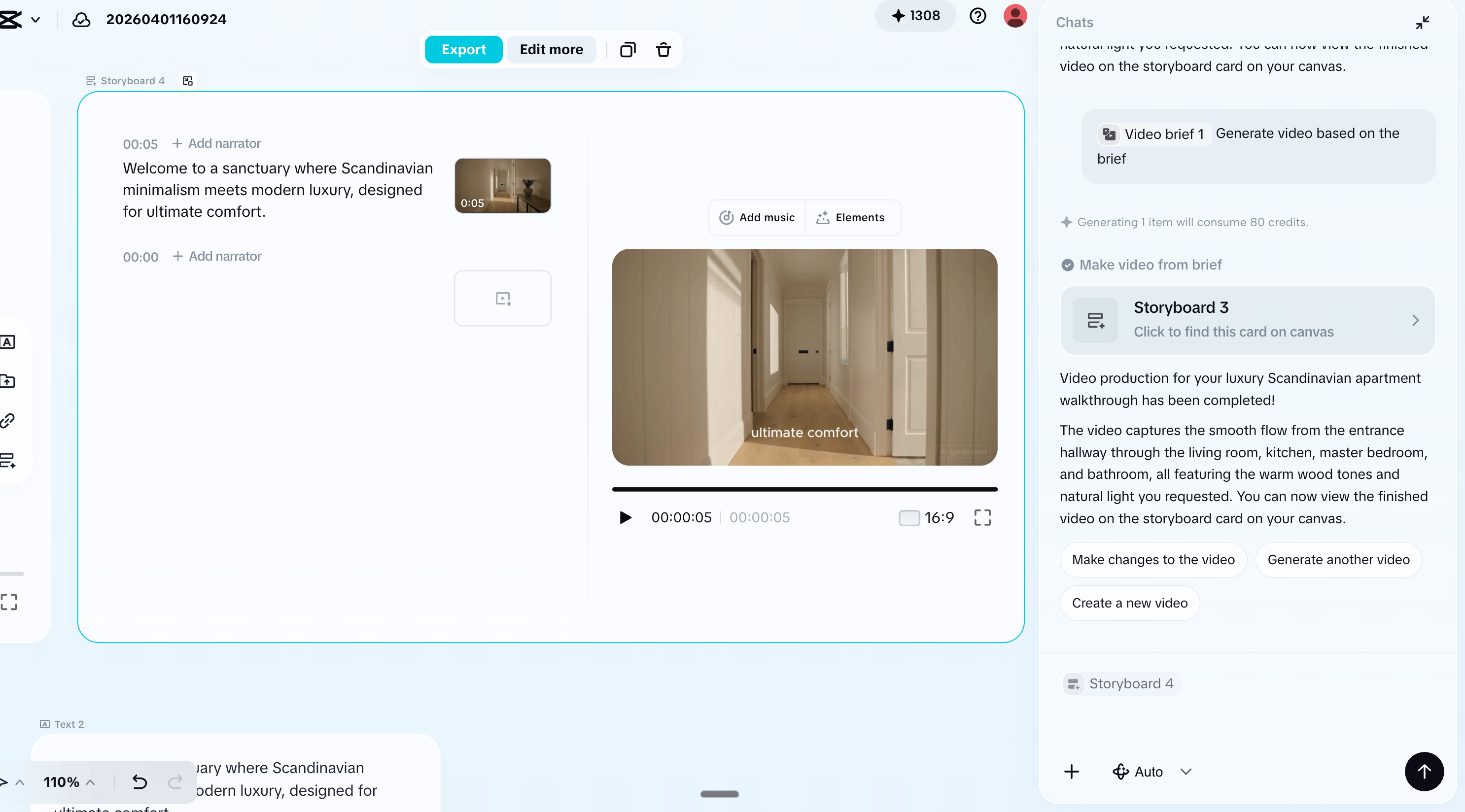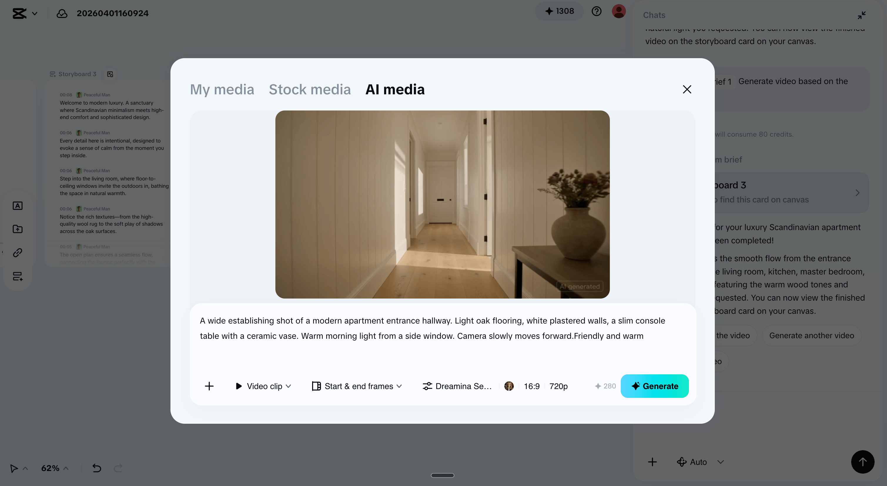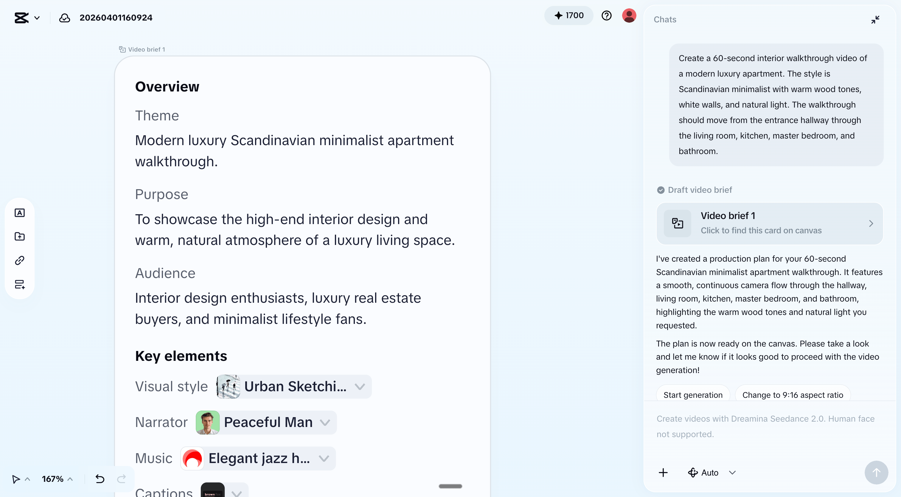 Create a 60-second interior walkthrough video of a modern luxury apartment. The style is Scandinavian minimalist with warm wood tones, white walls, and natural light. The walkthrough should move from the entrance hallway through the living room, kitchen, master bedroom, and bathroom.The AI uses this to plan the structure of your video. It will suggest a script and storyboard you can review before generating any footage.