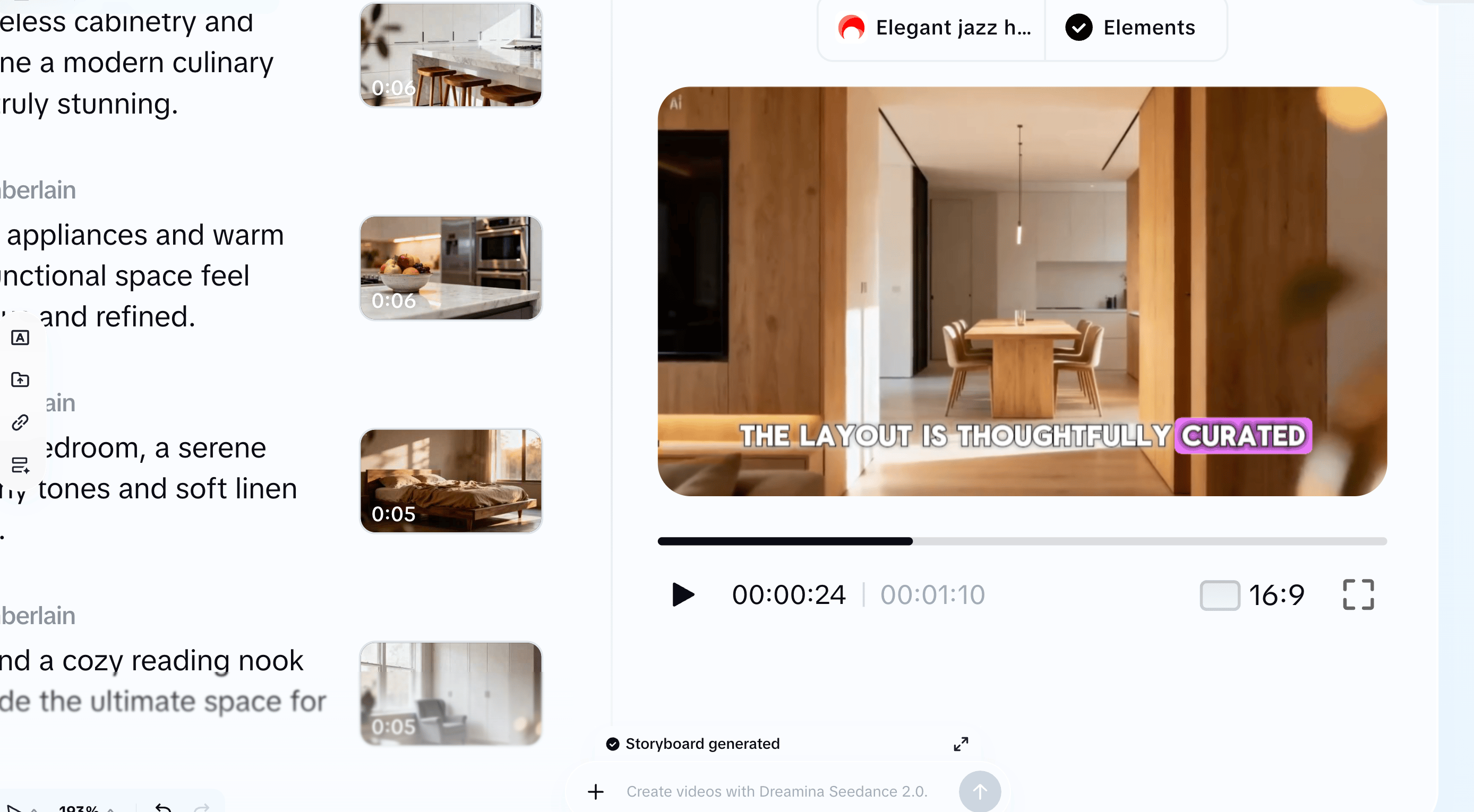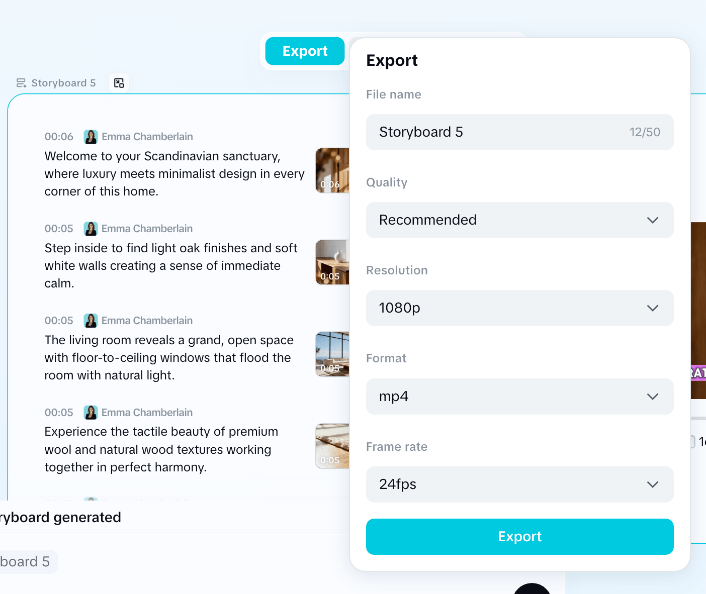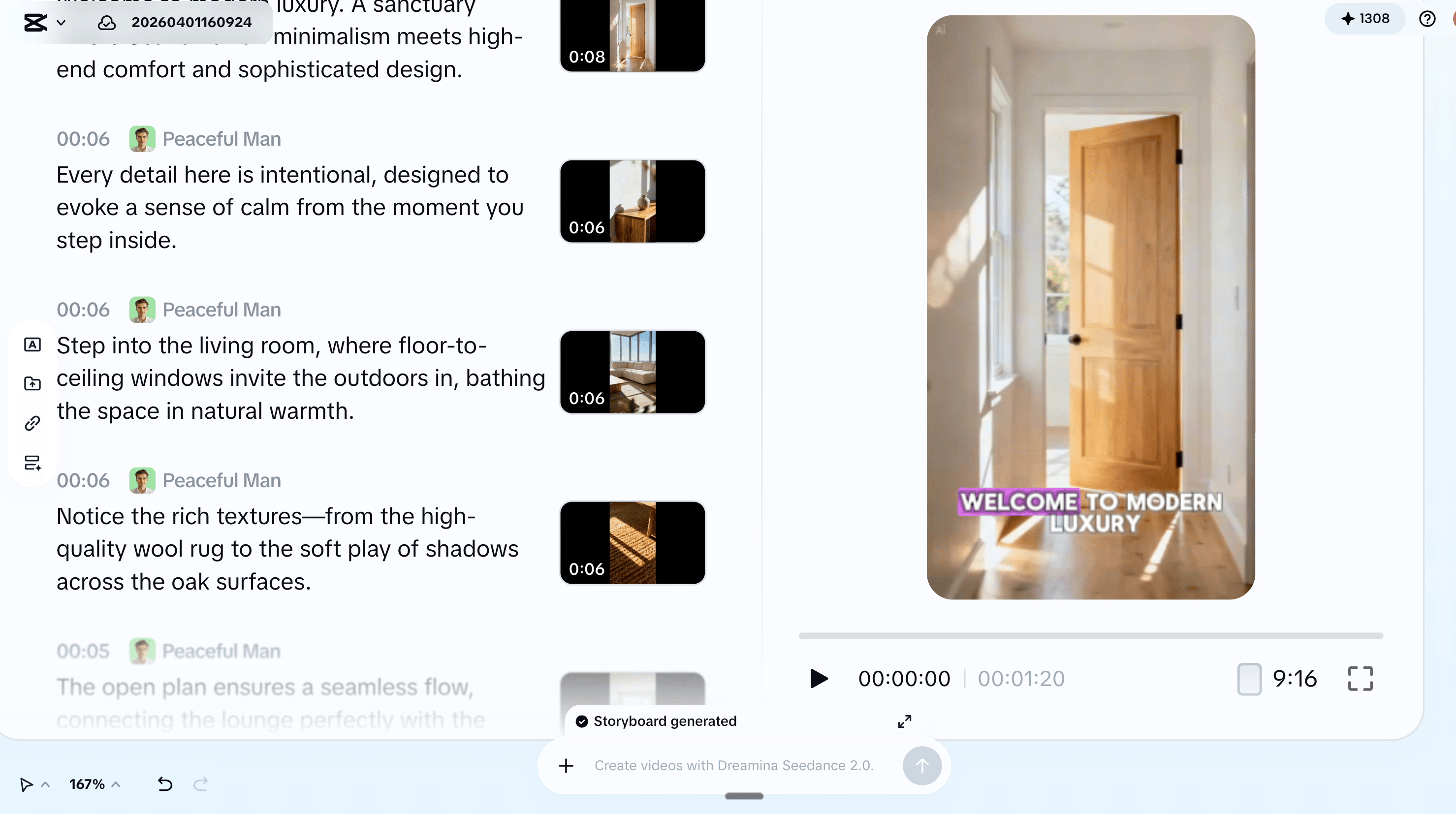 Create a 60-second interior walkthrough video of a modern luxury apartment. The style is Scandinavian minimalist with warm wood tones, white walls, and natural light. The walkthrough should move from the entrance hallway through the living room, kitchen, master bedroom, and bathroom.The AI uses this to plan the structure of your video. It will suggest a script and storyboard you can review before generating any footage.