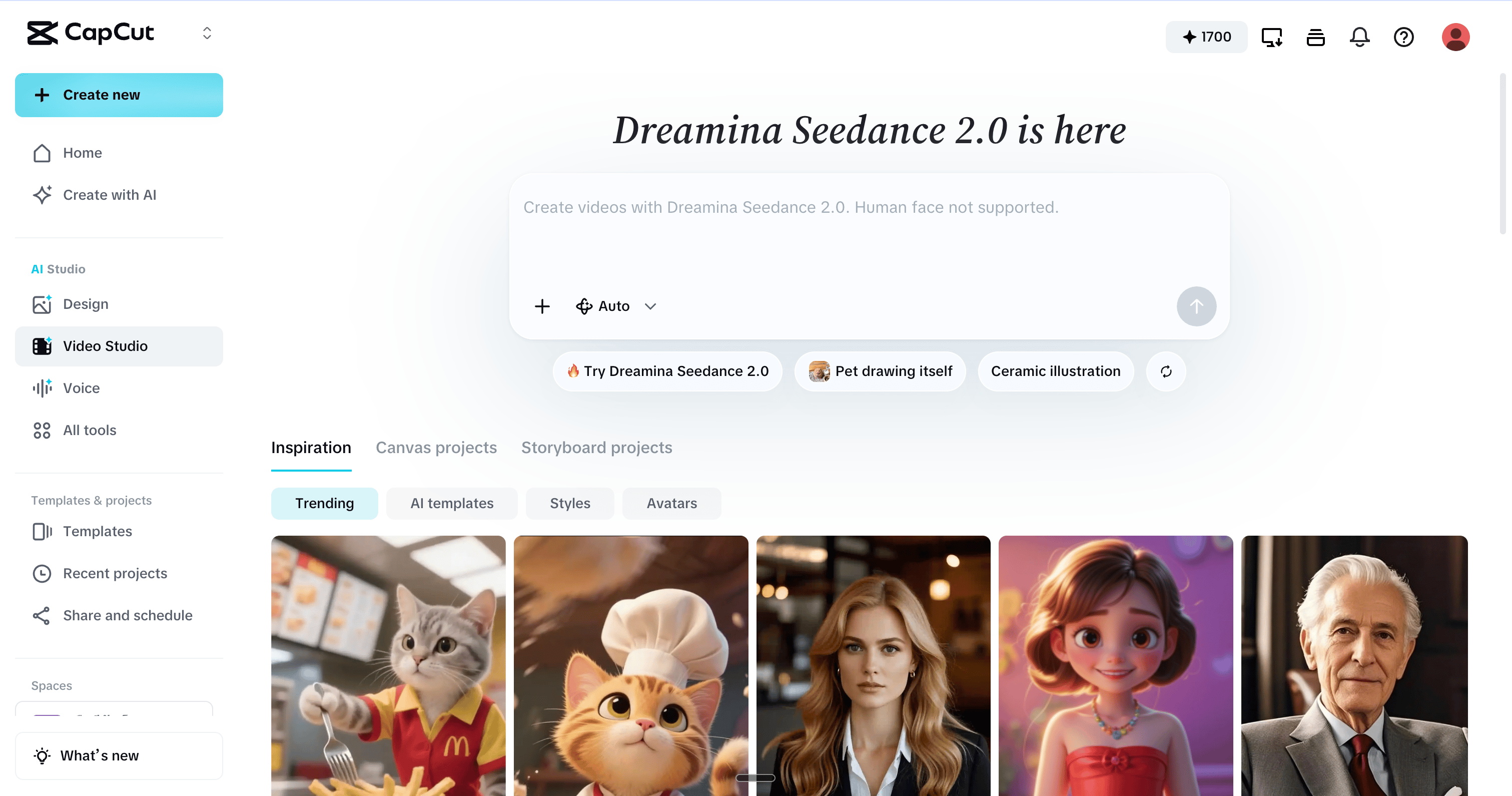 Go to capcut.com/tools/video-studio and sign in. You will land on the canvas workspace. There is no timeline here. Everything is laid out on an open, infinite canvas where you build your video scene by scene.
