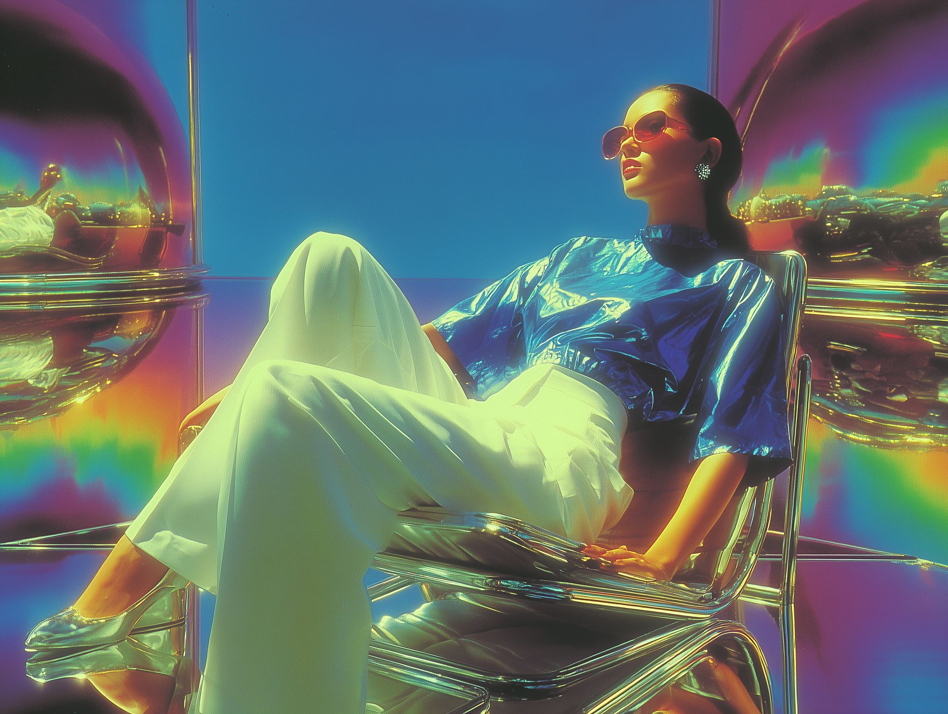 model 30y, luxury photo shooting style, fashion shooting, wearing blue top, white trousers, full figureImage Usage Suggestion: Fashion blogs