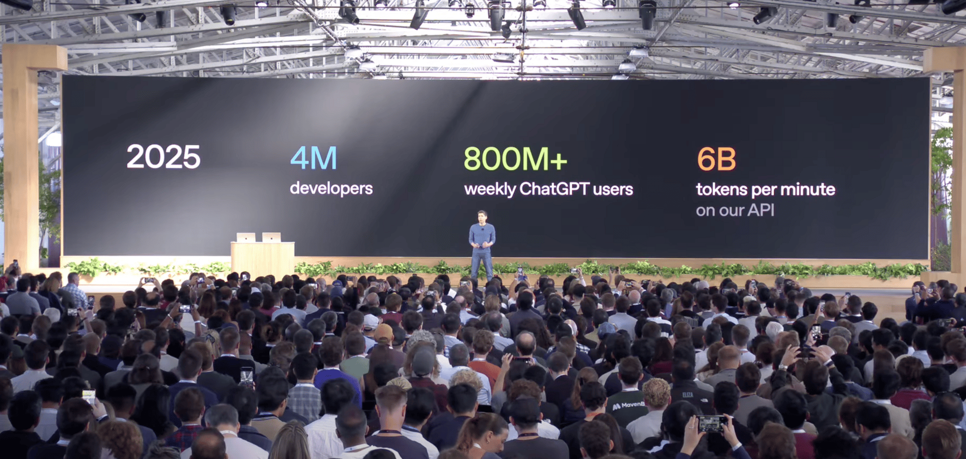 Market: ChatGPT hit 800 million weekly active users. The platform now handles 6 billion tokens per minute through its API, with 4 million developers building on OpenAI