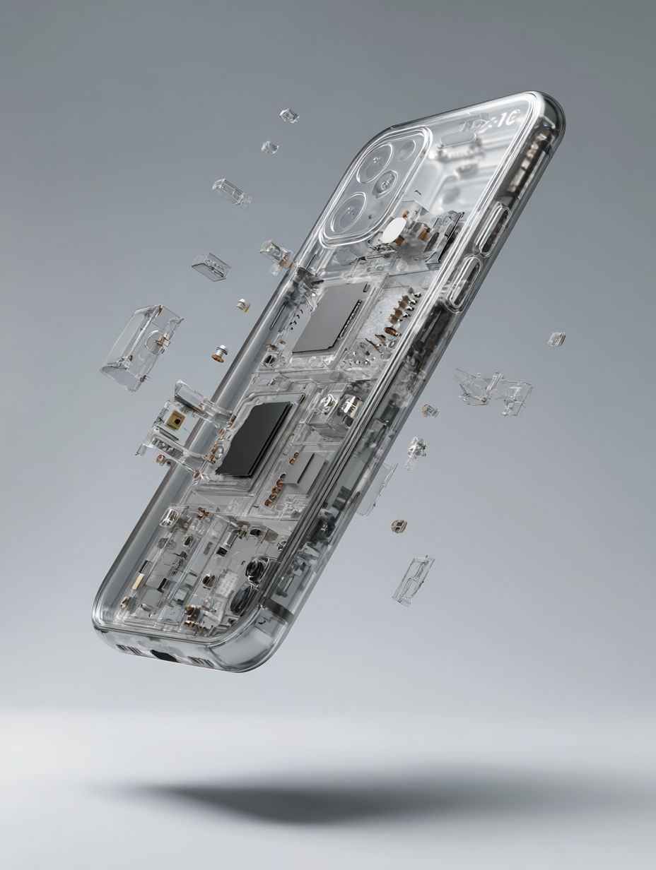 Midjourney Prompt: high tech transparent phone where you can see all the components underneath. floating in the air, profile view, product design, minimalism, Y2K style, matte plastic surfaces, plain gray background, studio lighting, hyper-realistic, Octane render.Image Usage Suggestion: Product photography